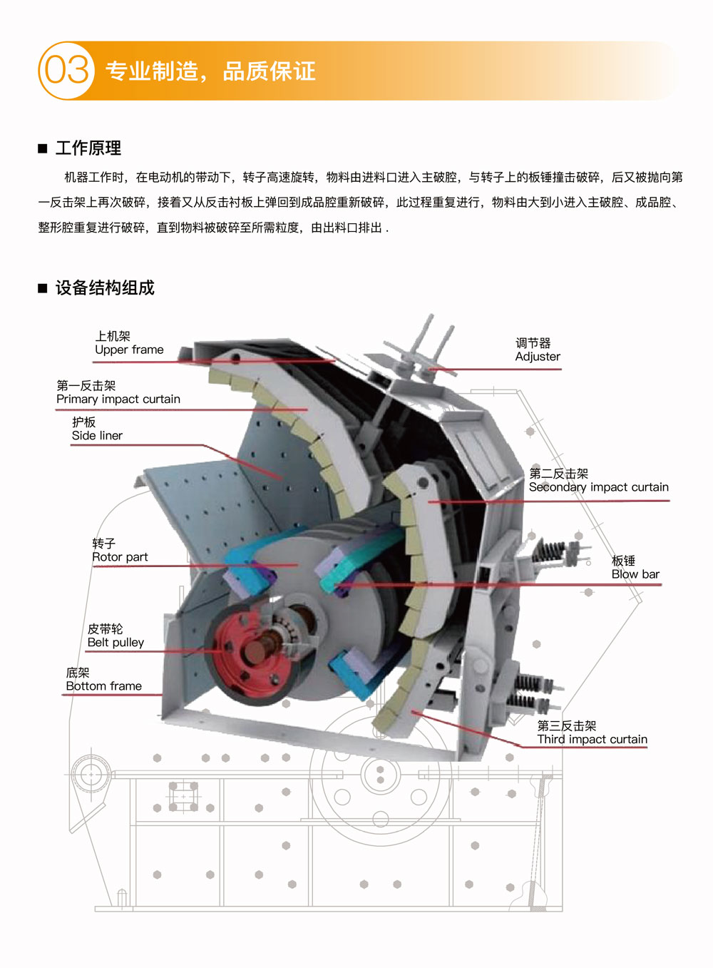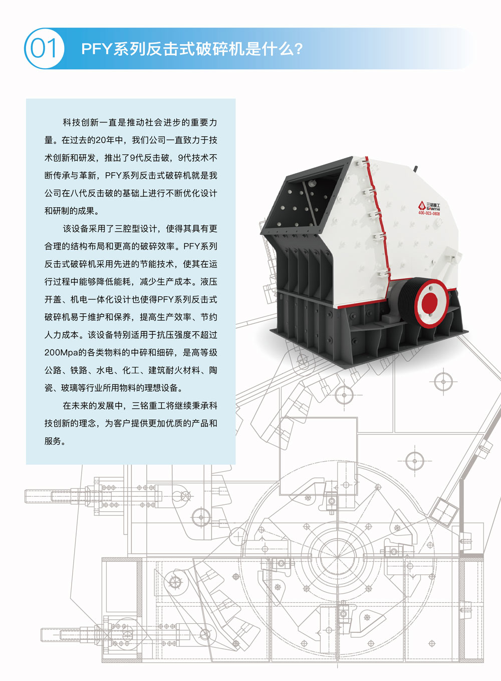 本系列產品是我司優化設計而研制出的一款三腔型反擊式破碎機,具備結構合理、破碎比大、產量高、能耗低、維修方便等特點,特別適用于抗壓強度不超過250Mpa的各類物料的中碎和細碎,是高等級公路、鐵路、水電、化工、建筑耐火材料、陶瓷、玻璃等行業所用物料的理想設備。